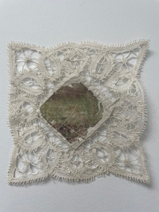 Linen cabinet dreams - Emily Akin - Found antique linens, acrylic medium, photographic transfer - NFS